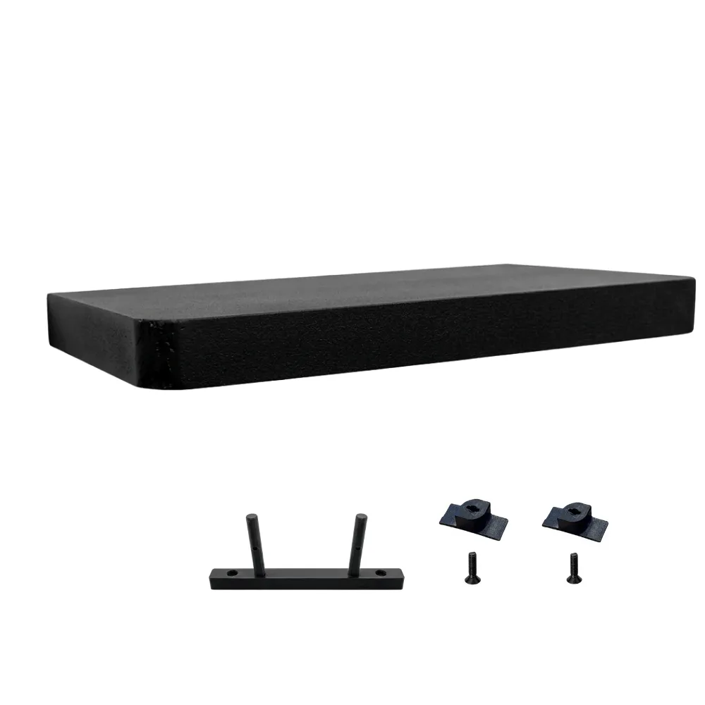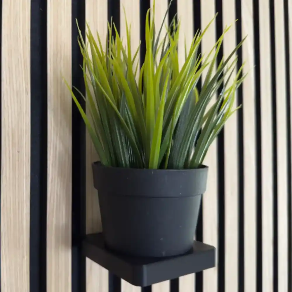 Minimalistische zwarte plank speciaal ontworpen voor akupanel wanden. Eenvoudig te plaatsen, zonder boren, en perfect voor een strak en luxe interieur.