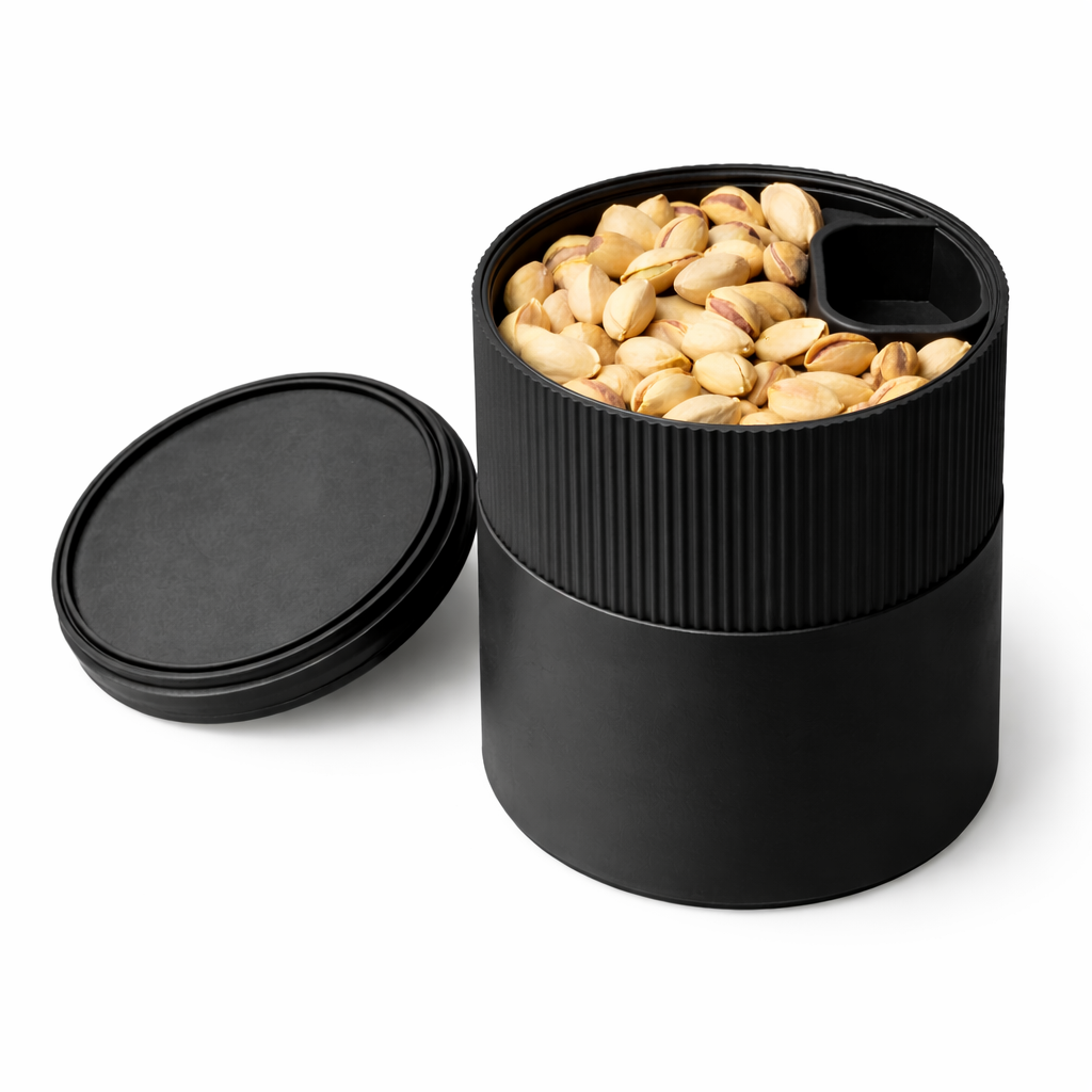 Minimalistische Japandi snackpot in mat zwart met deksel. Stijlvol en praktisch voor noten, snacks of kleine accessoires.